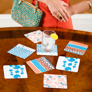 Continuing with this week's focus on Working Class Studio, we look at the Jesse collection of coasters designed by Jesse Walker. The assortment of vibrant, color-coordinating coasters comes in five designs. They are made of 60-point natural paperboard.Retailers: Contact the manufacturer for prices and minimums.