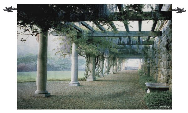 This wallhanging from Manual Woodworkers & Weavers depicts clearing morning mist over thick vines draped along a pergola found in Biltmore's gardens. It measures 70 inches tall and 50 inces wide.