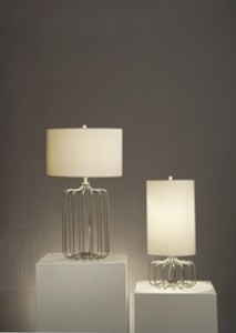 The Maya accent and table lamps (in the lefthand photo) from Nova Lighting are made of plated satin nickel. One measures 28 inches tall; the other 24 inches tall. The cage bases have a simple white shade.