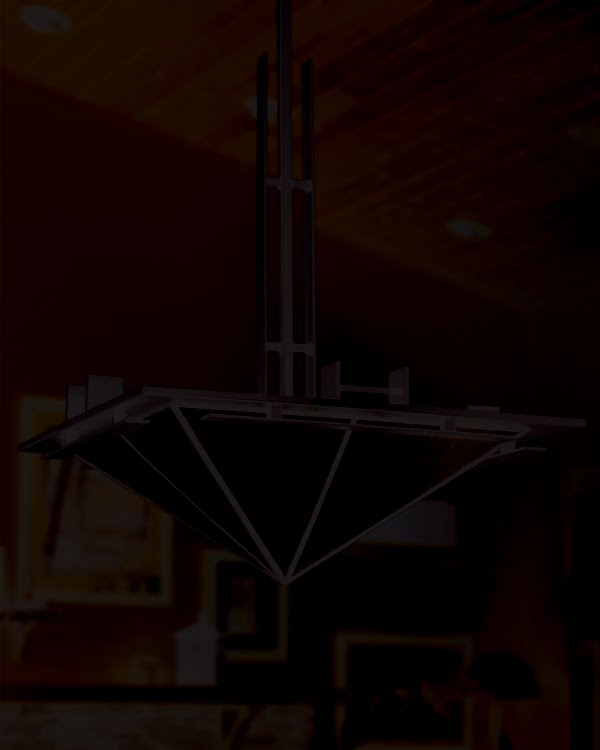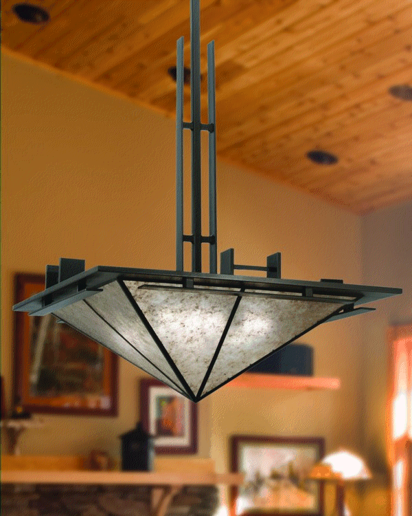 Meyda Custom Lighting's dimmable CFL (Compact Fluorescent) pendant line featues mica and art glass designs. The energy-efficient lighting fixtures are made in the USA. Shown is the new 36-inch-square "Lineage" inverted mica pendant with silver mica shade panels and hand-finished bronze hardware.