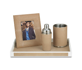 The new Maldives shagreen-embossed collection of leather accessories from Vellum includes barware, trays, frames and jewelry boxes. Color waves include sea glass vintage green and pearl (pictured), as well as chocolate brown, gray and red.