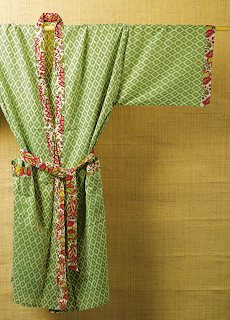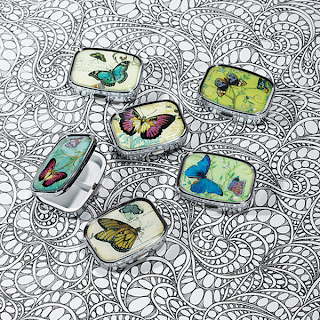 The hand-blocked voile robe from Two's Company is available in six colors and patterns. The Butterfly pill box with mirror comes with a velvet pouch.